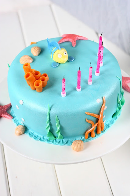 Tytär vietti kaverisynttäreitään kesäkuussa viikko sukulaissynttäreiden jälkeen. Molempien juhlien kakut noudattivat samaa meriaiheista teemaa. Ariel-kakun jälkeen teinkin tällaisen toisen hyvin samankaltaisen kakun, mutta tällä kertaa kakun päällä seikkaili Arielin sijasta vain hänen kaverinsa Nemo Pärsky. Lisäksi muutama simpukka sinne tänne ja vähän meriheinää- ja mitä-lie-meriruohon näköistä kakun reunoille :)