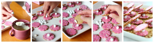 Tarjolla oli popcornien, kalkkunanakki-tomaatti-juusto-viinirypäletikkujen, suolakalojen, hedelmäkarkkien sekä vaahtokarkkien lisäksi myös alempana olevassa kuvassa näkyviä simpukkakeksejä. Keksien helmet ovat Mariannekuulia (jotka löysin pitkän etsinnän jälkeen ja kälyn vinkistä k-kaupasta). Tyttö auttoi simpukoiden tekemisessä ja liimasi kuulat kekseihin sulatetulla valkosuklaalla (alla kuvat 1-2). Keksit "niittasin" yhteen pienellä palalla valkosuklaamassaa (alla kuvat 3-4). Vuoan pohjalle murskattiin tytön kanssa yhteisvoimin vielä hieman digestive-keksejä hiekaksi (kuva 5).